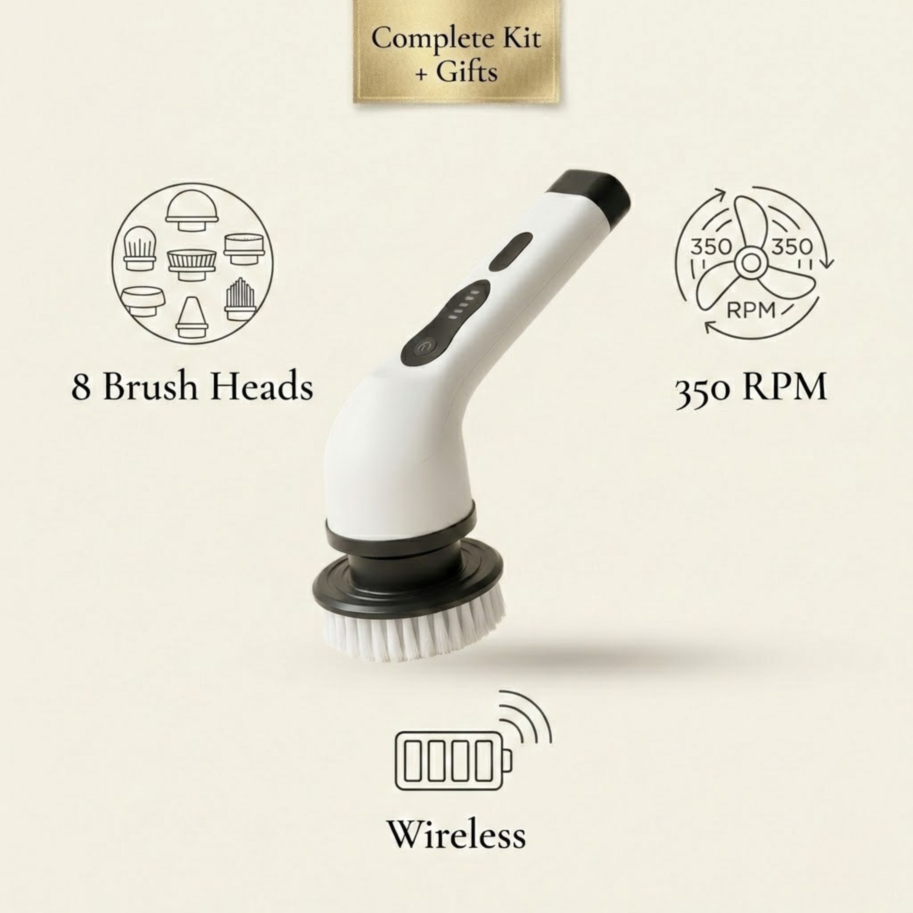 AuraBrush uses a high-torque motor that spins the brush heads up to 350 RPM, breaking down soap scum, mildew, and grime without scrubbing by hand. Just apply your cleaner, press a button, and let the motor do the heavy lifting.