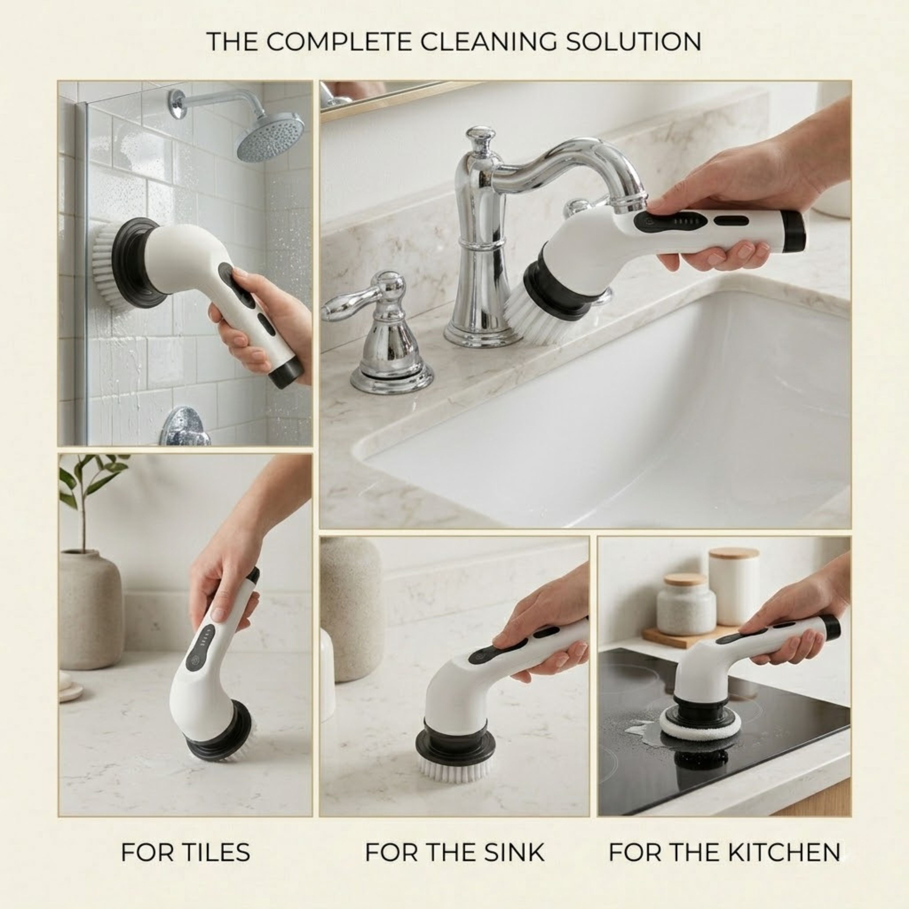 • Detail Brush – Targets tight spaces, faucets, and drain edges with precision.